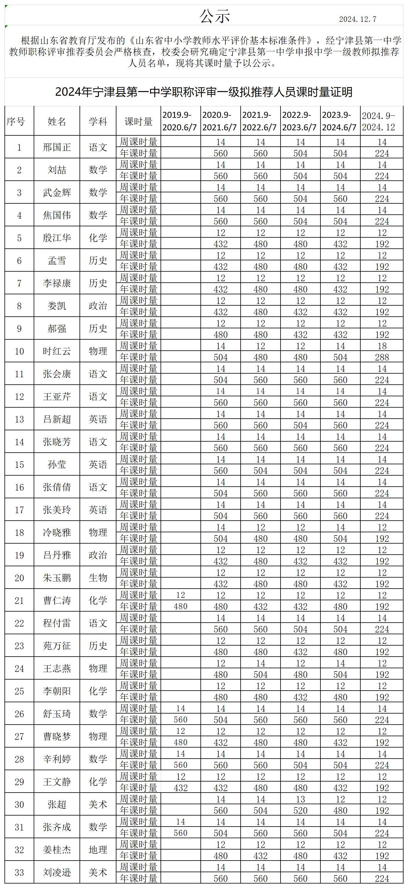 根据山东省教育厅发布的《山东省中小学教师水平评价基本标准条件》,经宁津县第一中学教师职称评审推荐委员会严格核查,校委会研究确定宁津县第一中学申报中学一级教师拟推荐人员名单,现将其课时量予以公示。(宁津县融媒体中心“智慧宁津”出品 宁津一中:彭文科)